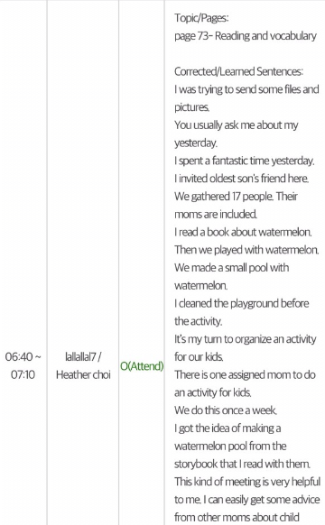 숙제도 어떻게서든 하려고 전날에 못했으면 수업 시작1시간 전에 해서 스카이프로 보내기도 하고!