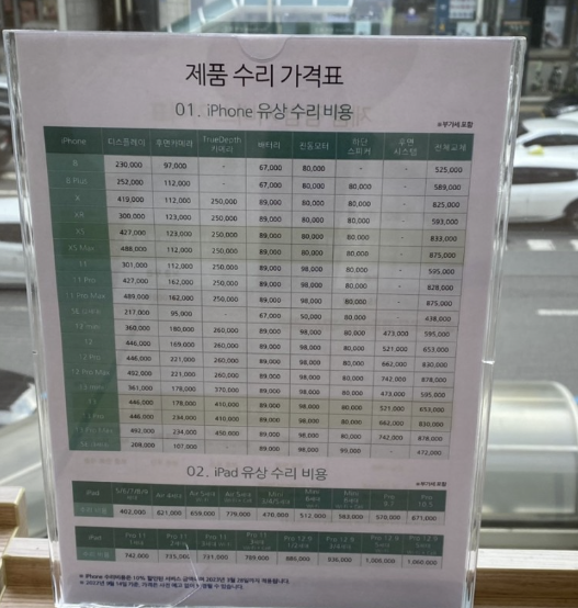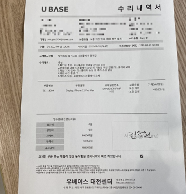 아이폰 11 프로 맥스의 디스플레이 수리 비용은 489,000원이였어요 ㅠㅠ 수리는 대략 40분 정도 소요되었어요