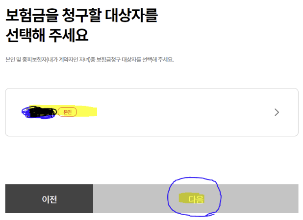 5. 보험금 청구자 이름을 확인한 후 [다음] 버튼을 클릭합니다.