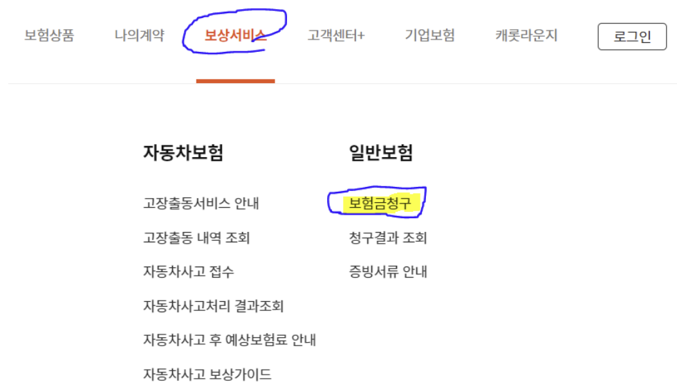 2. 보상서비스-일반보험-보험금청구 순서대로 접속합니다.