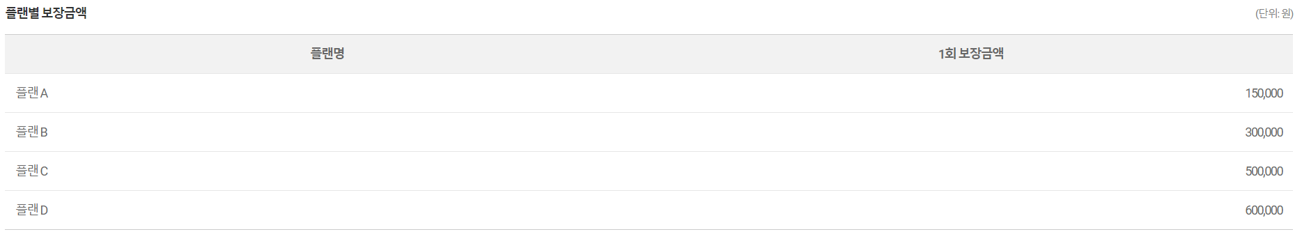 각 플랜의 1회 보장금액은 플랜A의 경우 15만원, 플랜B의 경우 30만원, 플랜C의 경우 50만원, 플랜D의 경우 60만원인데요.