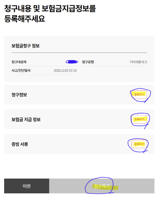 노란 부분은 이번에 보험금을 지급받고 기재한 사실이다