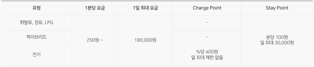 차량 상관없이 요금 자체는 동일하다. Charge Point와 Stay Point라고 추가적으로 포인트를 쌓아주는 서비스가 있다.