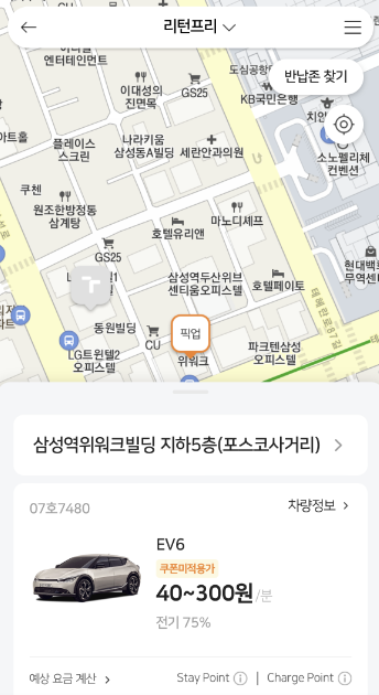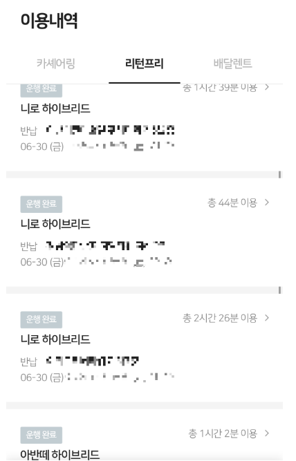 차량을 선택한다. 리턴프리는 시간이 생명이기 때문에 전기차의 경우 잔량이 별로 없다면 추천하지 않는다..