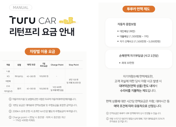 투루카 리턴프리로 제공되는 차량은 하이브리드와 전기 차량뿐이다. 그리고 대여요금과 주행요금이 아닌 분당 요금으로 청구된다. (대여 + 주행 + 보험)