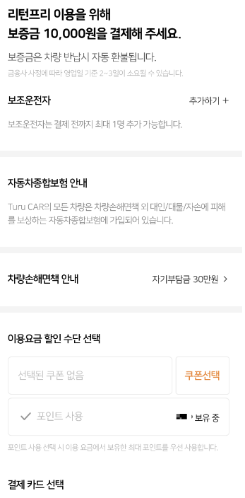 자기부담금으로 10,000원이 결제된다. 이용을 마치면 이용 요금을 결제하고 환불해 준다. (차액 환불이 아니다)