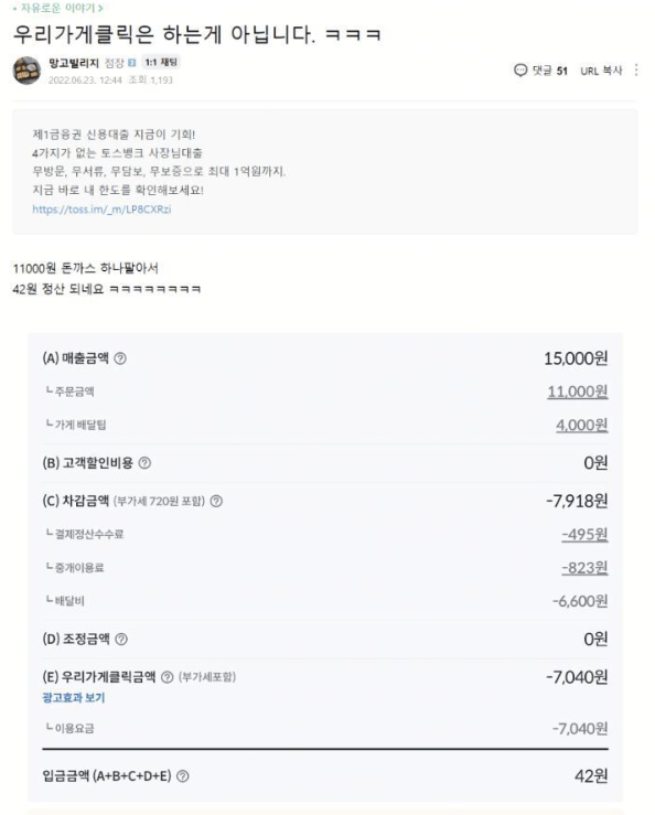 게다가 이 분들은 우리 가게 클릭이라는 슈퍼 광고를 사용했기 때문에 수익이 더 적었던 것도 있지만, 광고를 하지 않으면 매출 자체가 줄어들지 않을까요?