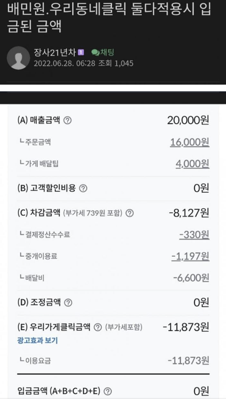 어떤 음식인지 나와있지 않지만 가격이 16,000원짜리를 팔았는데 배달비와 광고비를 빼고 나니 0 원남 았습니다.