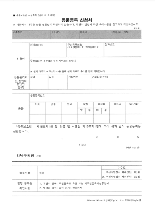 동물등록신청서 양식은 아래 첨부파일에서 다운로드 가능합니다.
