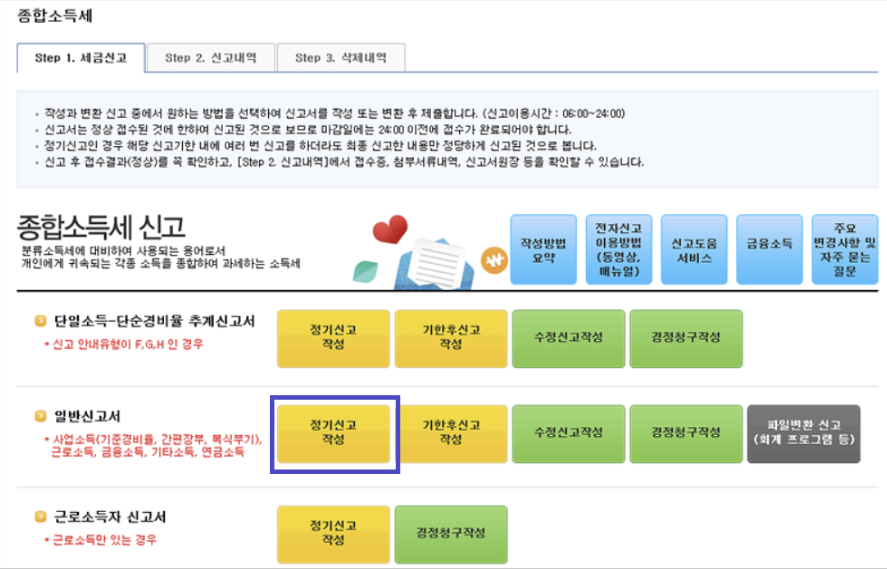 3. 아래 화면이 나오면 일반신고서 항목에 있는 [정기신고 작성] 메뉴를 클릭해줍니다.