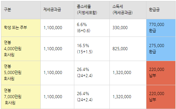 아무래도 소득이 없는 학생 또는 주부의 경우 환급액이 크며, 연봉이 높은 근로자일 수록 환급을 덜 받는 경향이 있는데요. 지금까지의 계산 예시는 물론 예시일 뿐이며, 실제로는 공제나 기타 종합소득을 고려하여 환급액이 결정되므로 차이가 있다는 점 참고하시길 바랍니다.