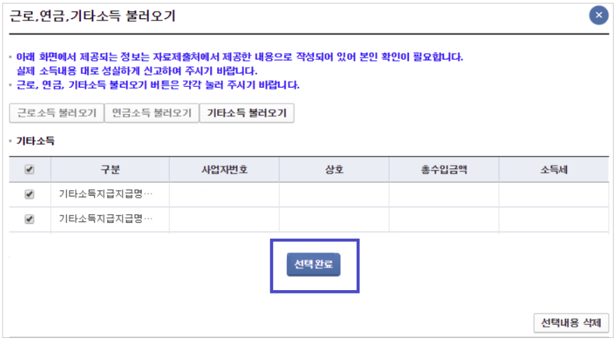 6. 우측에 있는 [기타소득 불러오기] 메뉴를 클릭하신 후 [선택완료] 버튼을 클릭해줍니다