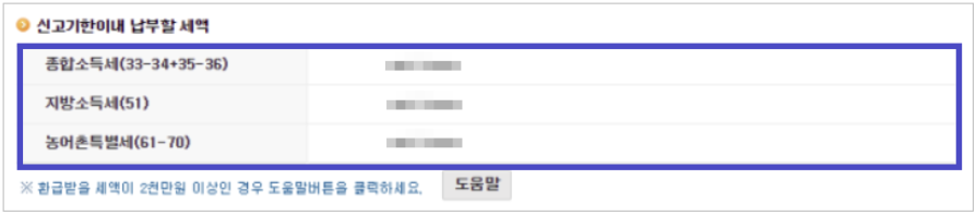 7. 그러면 신고기한이내 납부할 세액 항목이 나오는데요. 구체적으로는 종합소득세, 지방소득세, 농어촌특별세 까지 조회가 가능합니다. 마이너스(-) 부호로 표시된 금액만큼 환급이 가능하다는 뜻입니다.