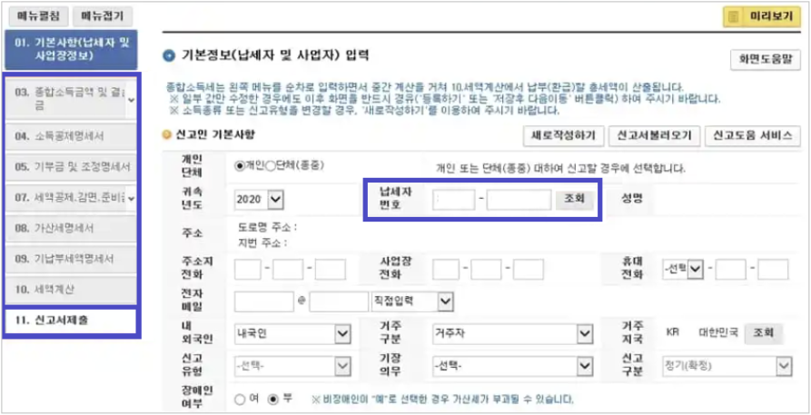 2. 좌측에 있는 [종합소득세 신고] 메뉴를 클릭합니다.