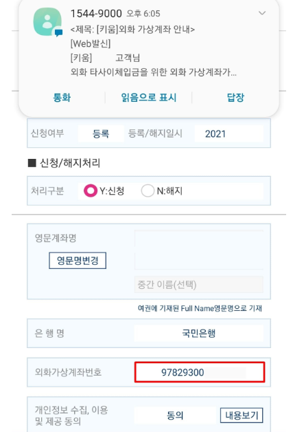 6. 키움증권 외화가상계좌 번호가 발급됩니다. 외화가상계좌번호란 해당 번호로 은행에서 도착하는 외화자금을 신속하게 파악한 후 증권계좌로 자금을 전송하는데 쓰이는 번호 입니다. 무통장 입금 처럼 돈을 이체시켜야 하는 가상의 통장번호라고 생각하시면 됩니다.