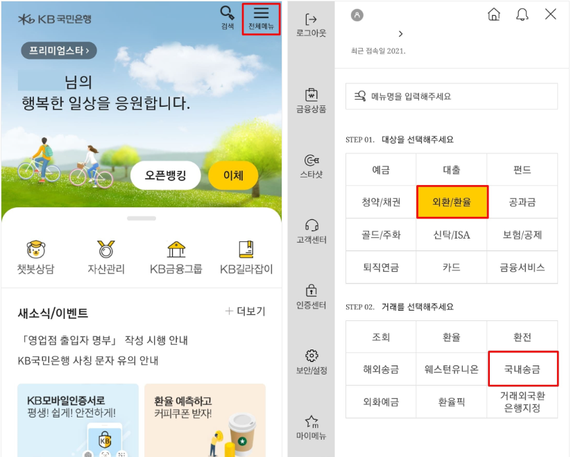 7. KB스타뱅킹 어플리케이션을 실행 후 우측 상단 전체 메뉴를 클릭, [외환/환율] > [국내송금]을 클릭합니다.