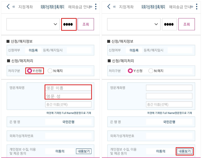 4. 하단 영문계좌명에서 여권에 기재된 Full Name 영문 이름 및 영문 성을 입력하고 개인정보 수집, 이용 및 제공 동의 우측의 내용보기를 클릭합니다.